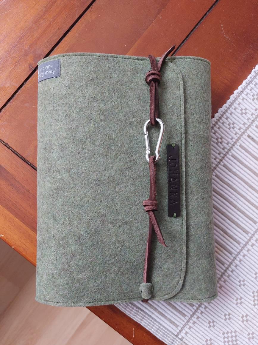 Leider ist die Filz Farbe doch deutlich dunkler als erwartet. Ich hatte ein Frühlingshaftes frisches Hellgrün erwartet und erhalten habe ich ein herbstliches Grün, ist aber auch ok. Das Ringbuch sieht sehr gut aus
